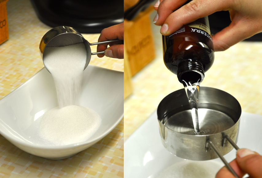 3. Add 10-12 drops of your favorite dōTERRA essential oil or blend in the sugar/oil mixture and stir.